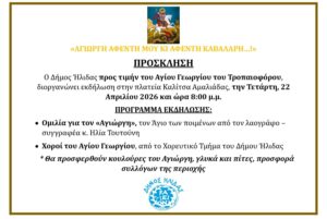 Την Τετάρτη 22 Απριλίου 2026 και ώρα 10:00, η Πυροσβεστική Υπηρεσία Πύργου…