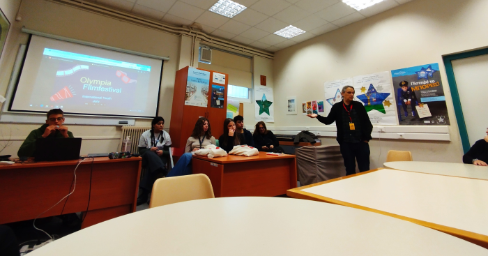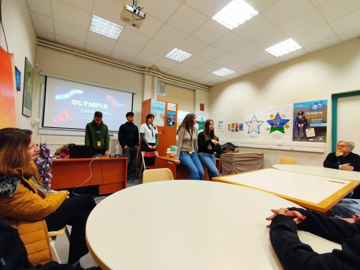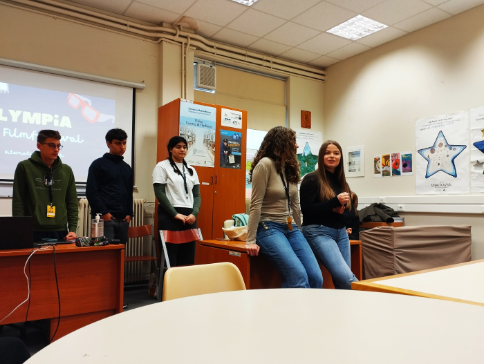 Μαθητές και μαθήτριες της Γ’ τάξης του σχολείου είχαν την ευκαιρία να συναντήσουν τα μέλη της επιτροπής και να συνομιλήσουν για την εμπειρία τους να είναι μέλη κριτικών επιτροπών, να συμμετέχουν σε διεθνή φεστιβάλ κινηματογράφου για παιδιά και νέους, καθώς και την εμπειρία τους από το φεστιβάλ Ολυμπίας. Παρουσιάστηκαν βίντεο και φωτογραφίες από το πρόγραμμα των μελών της Διεθνούς Κριτικής Επιτροπής Νέων στο Φεστιβάλ Ολυμπίας την εβδομάδα του Φεστιβάλ, που περιελάμβανε παρακολούθηση και αξιολόγηση ταινιών, συζήτηση των μελών της επιτροπής για τις ταινίες, κοινωνικές δραστηριότητες κ.α..