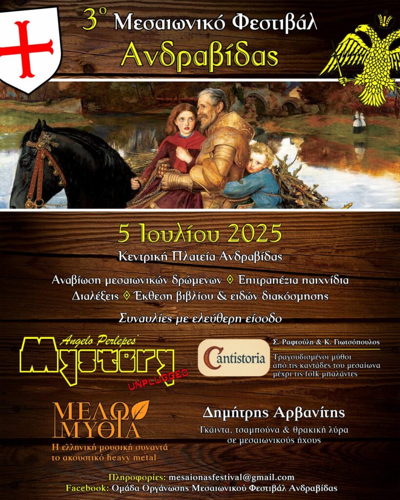 Το Σάββατο 5 Ιουλίου 2024, θα πραγματοποιηθεί το 3ο Μεσαιωνικό Φεστιβάλ Ανδραβίδας, στην κεντρική πλατεία της Ανδραβίδας, δίπλα στον μεσαιωνικό ναό της Αγίας Σοφίας, με ώρα έναρξης των δρώμενων 20:30. Το Φεστιβάλ θα περιλαμβάνει συναυλίες, αναβίωση μεσαιωνικών δρώμενων από μέλη των πολιτιστικών ομάδων «Ritterhellas-Έλληνες Ιππότες», «Suntouched, Order of The Sun», «Forsaken Somnia», Tandrial Lions» από το LARP πεδίο Chronicles Of Annor (κι από άλλες ομάδες αναβιωτών που θα ανακοινωθούν προσεχώς), επιδείξεις ταχυδακτυλουργών και ακροβατών.