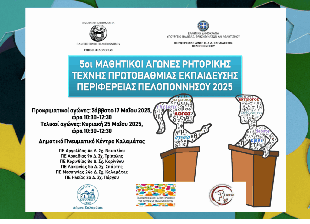 Με μεγάλη επιτυχία ολοκληρώθηκαν οι 5οι Μαθητικοί Αγώνες Ρητορικής Τέχνης για την Πρωτοβάθμια Εκπαίδευση (Ε΄ και ΣΤ΄ τάξης Δημοτικού), που διοργανώνει το Τμήμα Φιλολογίας του Πανεπιστημίου Πελοποννήσου και η Περιφερειακή Διεύθυνση Π/θμιας και Δ/θμιας Εκπαίδευσης Πελοποννήσου, στους οποίους συμμετέχει για τρίτη συνεχή χρονιά και η Δ/νση Π/θμιας Εκπαίδευσης Ηλείας με πρωτοβουλία του Δ/ντή Εκπαίδευσης κ. Ανδρέα Καρατζά.