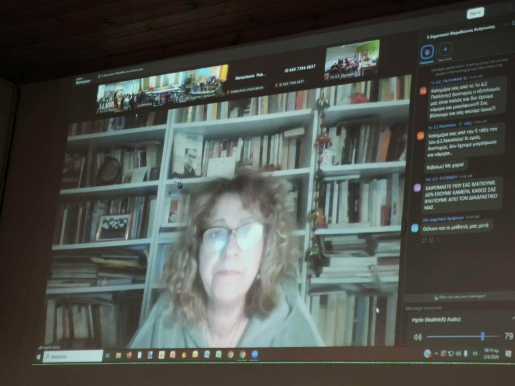 Καλεσμένη της εκδήλωσης ήταν η συγγραφέας Αγγελική Δαρλάση, η οποία μίλησε διαδικτυακά στους μαθητές για την προσωπική της πορεία στη συγγραφή, τις πηγές έμπνευσής της και τη σημασία του διαβάσματος στη ζωή μας.