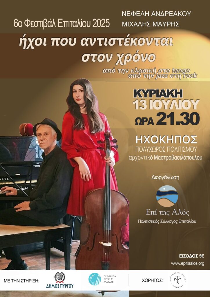 Μια μουσική παράσταση γεμάτη εικόνες, αφηγήσεις και τραγούδια, από τον Μπαχ στον Λέοναρντ Κοέν και από το “Besame Mucho” στο “Let It Be”, τα τραγούδια ενώνονται με λόγο θεατρικό και νοσταλγική ατμόσφαιρα, θα απολαύσουμε το βράδυ της Κυριακής 13 Ιουλίου, ώρα 21.30 στον Ηχόκηπο του Αρχοντικού Μαστροβασιλόπουλου. Η εκδήλωση διοργανώνεται στο πλαίσιο του 6ου Φεστιβάλ Επιταλίου, από τον Επι της Αλός Πολιτιστικό Σύλλογο με την στήριξη του Δήμου Πύργου και της Περιφέρειας Δυτικής Ελλάδας (ΠΕ Ηλείας).Χορηγός της εκδήλωσης είναι η @MonemvasiaWinery