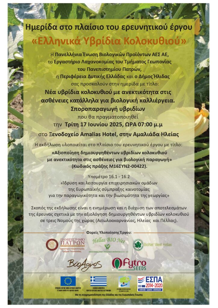 Η εκδήλωση υλοποιείται στο πλαίσιο του ερευνητικού έργου με τίτλο: «Αξιοποίηση δημιουργηθέντων υβριδίων κολοκυθιού με ανεκτικότητα στις ασθένειες για βιολογική παραγωγή» (Κωδικός πράξης Μ16ΣΥΝ2-00422)