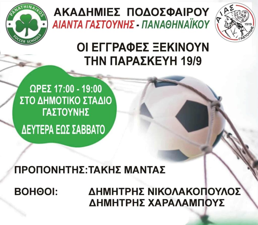 Οι εγγραφές ξεκινούν την ερχόμενη Παρασκευή 19 Σεπτεμβρίου και θα γίνονται καθημερινά από Δευτέρα έως και Σάββατο, 5μ.μ.-7μ.μ., στο Δημοτικό Στάδιο Γαστούνης. «Έλα κι εσύ για να γνωρίσεις νέους φίλους και να νιώσεις την χαρά του παιχνιδιού», αναφέρει ο Αίας Γαστούνης, που οργανώνεται σε όλα τα επίπεδα, ωστόσο το γηπεδικό πρόβλημα αποτελεί «τροχοπέδη», που πρέπει να ξεπεραστεί, ώστε ο Αίας να συνεχίσει να κάνει βήματα εμπρός, που είναι και το όραμά του.