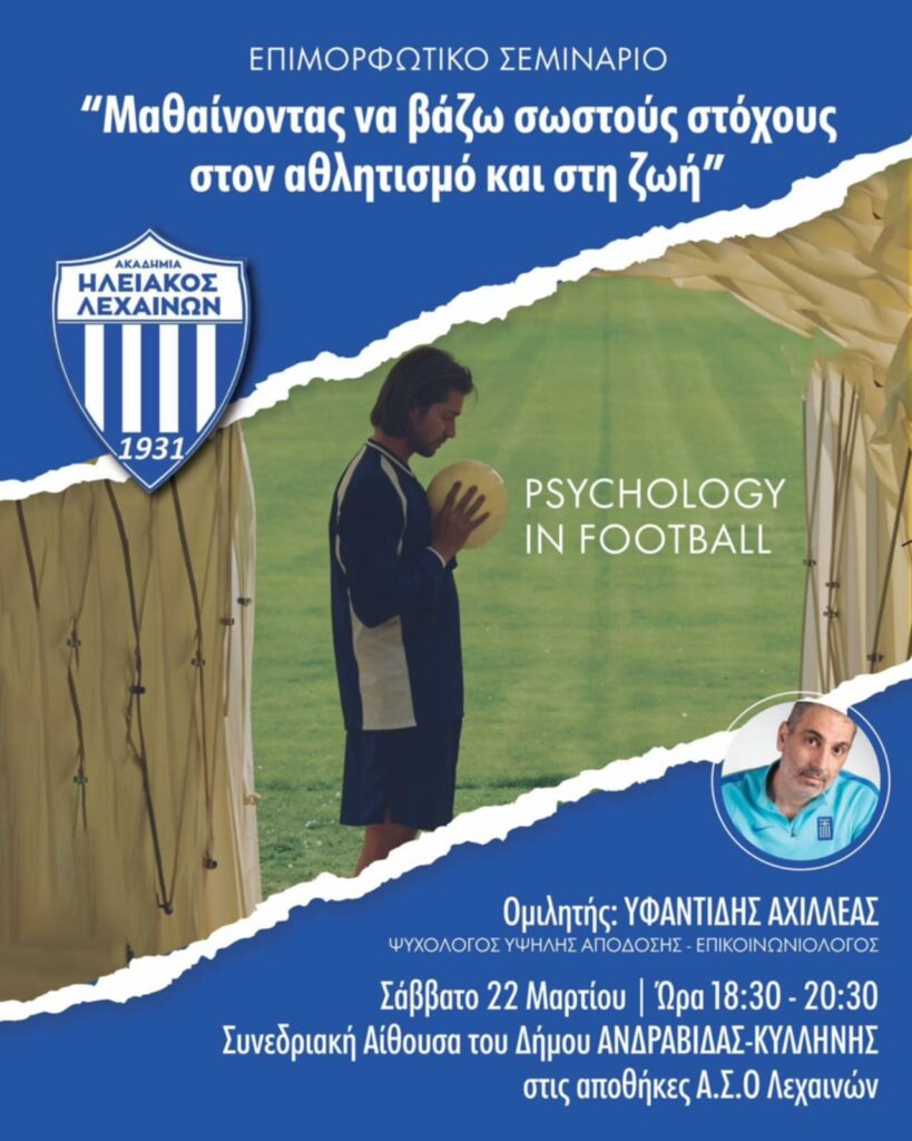 Η ανακοίνωση-πρόσκληση του Ηλειακού αναφέρει: «Με χαρά προσκαλούμε όλες τις Ακαδημίες του Νομού μας όπως και την διοργανώτρια αρχή Ε.Π.Σ.Η. με τους αντιπροσώπους της, τα σχολεία όλων των βαθμίδων, αλλά και όλους τους αθλητικούς συλλόγους που σχετίζονται με τον αθλητισμό, το Σάββατο 22/3 και ώρα 18:30 – 20:30 στο επιμορφωτικό σεμινάριο Αθλητικής Ψυχολογίας με θέμα: “Μαθαίνοντας να βάζω σωστούς στόχους στον αθλητισμό και την ζωή”, που θα πραγματοποιηθεί στην Συνεδριακή αίθουσα του Δήμου Ανδραβίδας-Κυλλήνης στις Αποθήκες Α.Σ.Ο. Λεχαινών. Ομιλητής ο γνωστός σε όλους μας Ψυχολόγος Υψηλής απόδοσης και Επικοινωνίας των σχολών UEFA και Ε.Π.Ο., αλλά και συγγραφέας Αχιλλέας Υφαντίδης».
