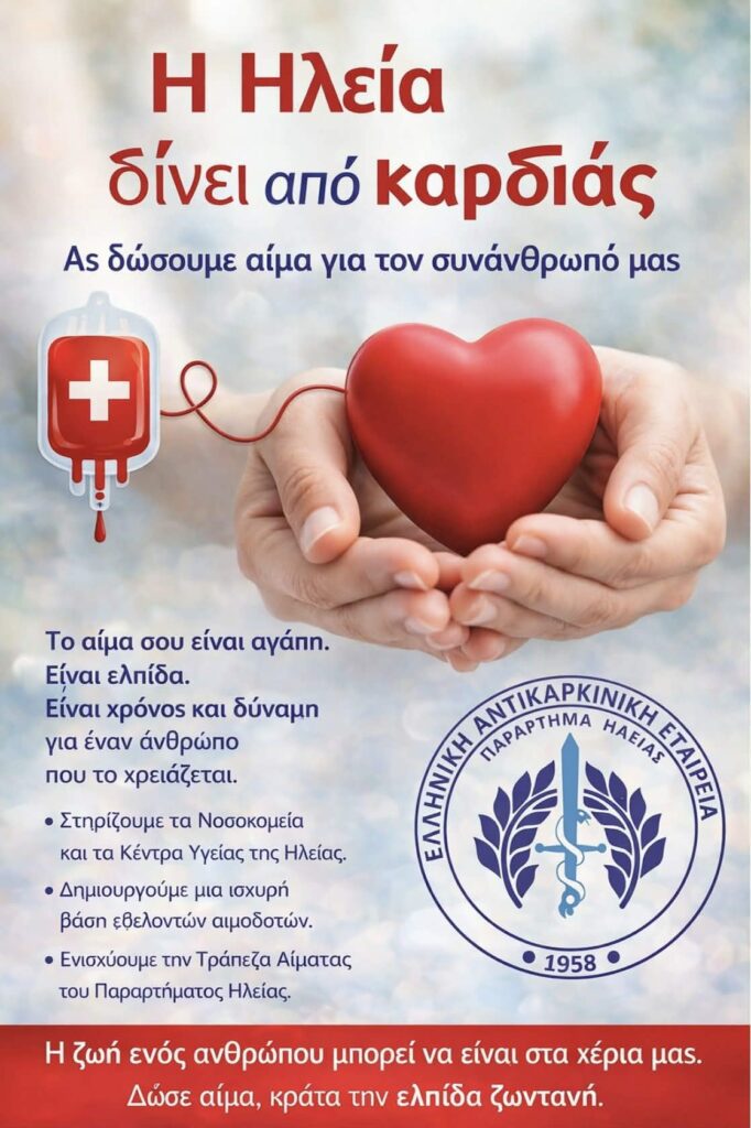 Η ανάγκη για αίμα είναι διαρκής και πραγματική. Σε θεραπείες, σε χειρουργεία, σε επείγοντα περιστατικά, το αίμα αποτελεί προϋπόθεση ζωής. Οι υγειονομικοί της Ηλείας εργάζονται με συνέπεια και αφοσίωση για να καλύπτουν αυτές τις ανάγκες. Η κοινωνία μπορεί και οφείλει να σταθεί δίπλα τους.