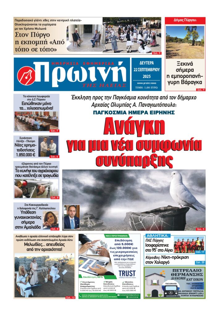 Κατά αρχήν και για την αποκατάσταση της αλήθειας η Πρωινή δεν αφιέρωσε ολόκληρο το πρωτοσέλιδό της στη δήλωση του δημάρχου Ολυμπίας, αλλά  συμπεριέλαβε την δήλωσή του στο αφιέρωμά της για την Παγκόσμια Ημέρα Ειρήνης. Και επειδή προφανώς μας βρίσκει απόλυτα σύμφωνους το πνεύμα αυτής της δήλωσης  «Ανάγκη για μια νέα παγκόσμια συμφωνία συνύπαρξης», στους χαλεπούς καιρούς που ζούμε, την υιοθετήσαμε και στον τίτλο μας.