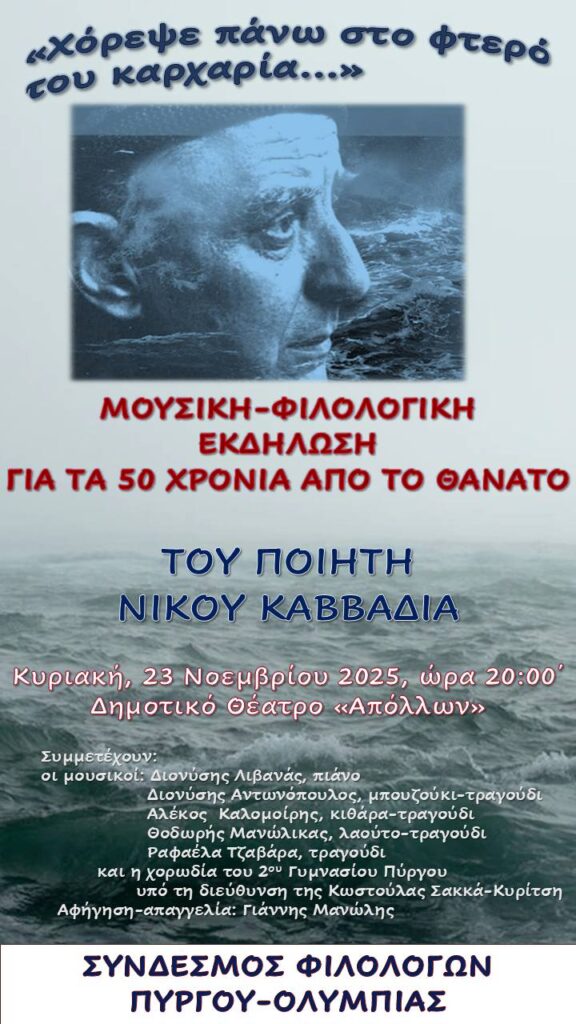 Ένα αφιέρωμα στον σπουδαίο μας ποιητή Νίκο Καββαδία με τίτλο «Χόρεψε πάνω στο φτερό του καρχαρία» ετοιμάζει ο Σύνδεσμος Φιλολόγων Πύργου- Ολυμπίας με μια ξεχωριστή φιλολογική και μουσική εκδήλωση που θα πραγματοποιηθεί την Κυριακή 23 Νοεμβρίου 2025 στο θέατρο Απόλλων.