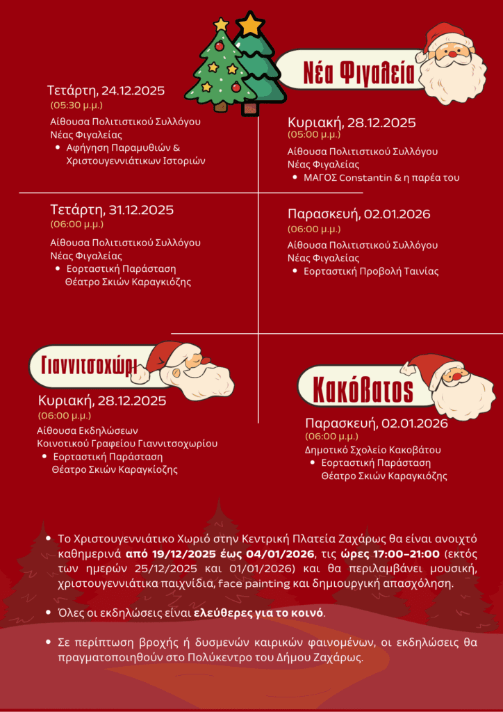 - Το Χριστουγεννιάτικο Χωριό στην Κεντρική Πλατεία Ζαχάρως θα λειτουργεί καθημερινά από 19/12/2025 έως 04/01/2026, τις ώρες 17:00–21:00, εκτός των ημερών 25/12/2025 και 01/01/2026.