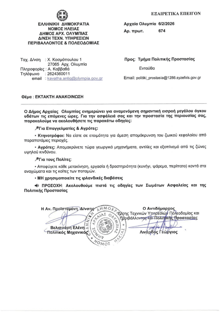 Ο Δήμος Αρχαίας Ολυμπίας ενημερώνει για αναμενόμενη σημαντική εισροή μεγάλου όγκου υδάτων τις επόμενες ώρες.