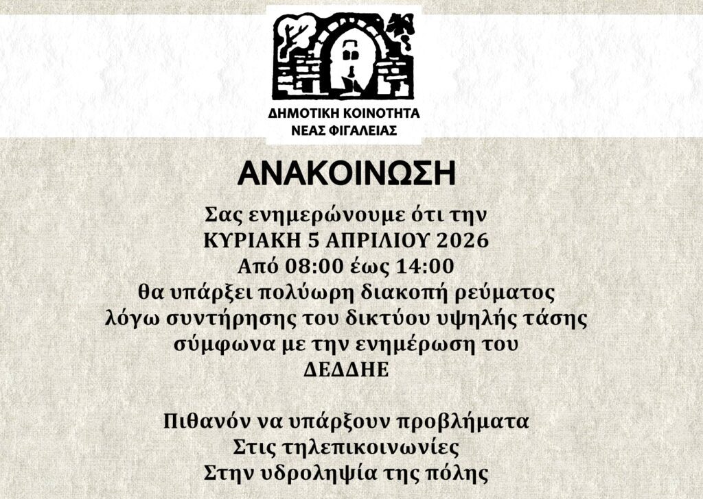 Πολύωρη διακοπή ρεύματος έχει προγραμματιστεί για την Κυριακή 05/04 στην Δ.Κ. Νέας Φιγαλείας από 8:00 έως 14:00 λόγω συντήρησης του Δικτύου Υψηλής Τάσης από τον ΔΕΔΔΗΕ.