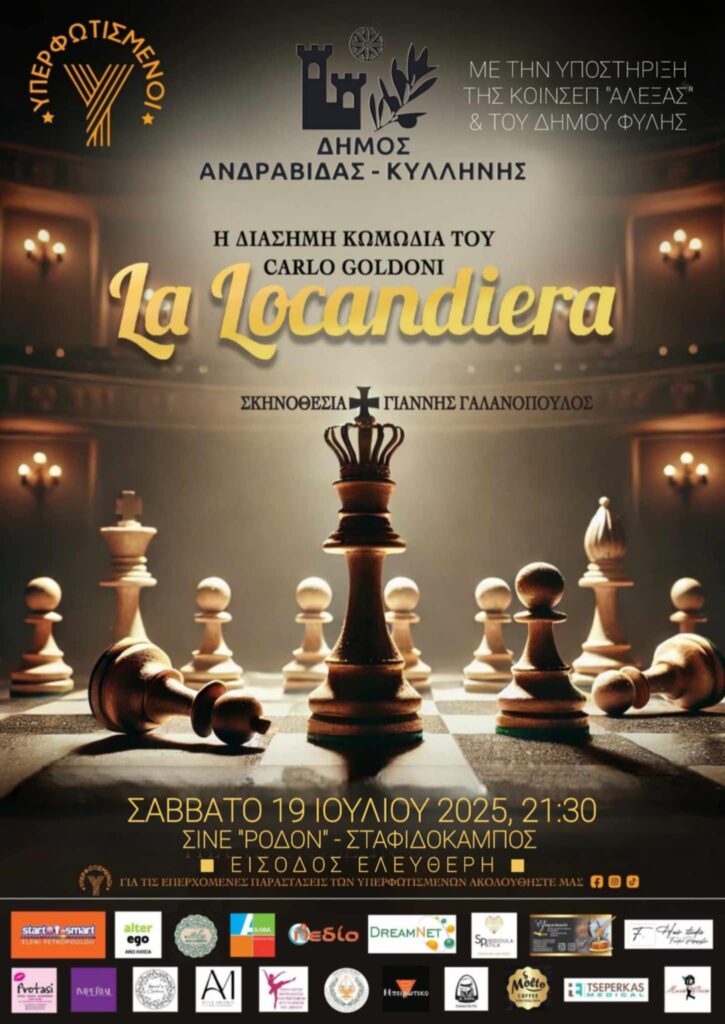Οι «Υπερφωτισμένοι» του Σταφιδοκαμπίτη Γιάννη Γαλανόπουλου επιστρέφουν για μια ακόμη χρονιά στο Διεθνές Φεστιβάλ του Δήμου Ανδραβίδας-Κυλλήνης. Με μια υπέροχη διασκευή της διάσημης κωμωδίας του Κάρλο Γκολντόνι «La Locandiera» το Σάββατο 19 Ιουλίου 2025 στις 21:30 με είσοδο ελεύθερη, στο Σινέ «Ρόδον» στον Σταφιδόκαμπο. Με την υποστήριξη της ΚΟΙΝΣΕΠ «ΑΛΕΞΑΣ» και του Δήμου Φυλής.