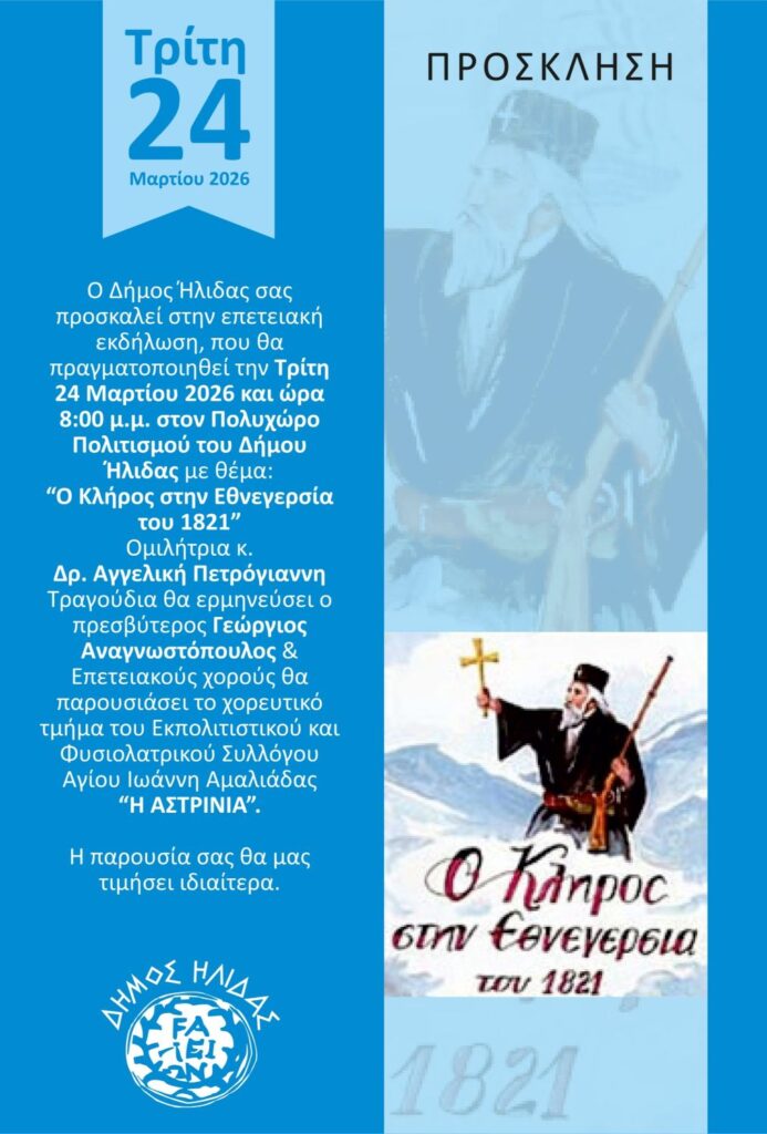 Ο Δήμος Ήλιδας, τιμώντας την εθνική επέτειο της παλιγγενεσίας του Έθνους, σας προσκαλεί στην επετειακή εκδήλωση, με τίτλο: «Ο ΚΛΗΡΟΣ ΣΤΗΝ ΕΘΝΕΓΕΡΣΙΑ ΤΟΥ 1821». Η εκδήλωση, που τελεί υπό τη σεπτή σκέπη της Ιεράς Μητροπόλεως Ηλείας και Ωλένης, θα πραγματοποιηθεί την Τρίτη 24 Μαρτίου 2026 και ώρα 20:00, στον Πολυχώρο Πολιτισμού Αμαλιάδας.