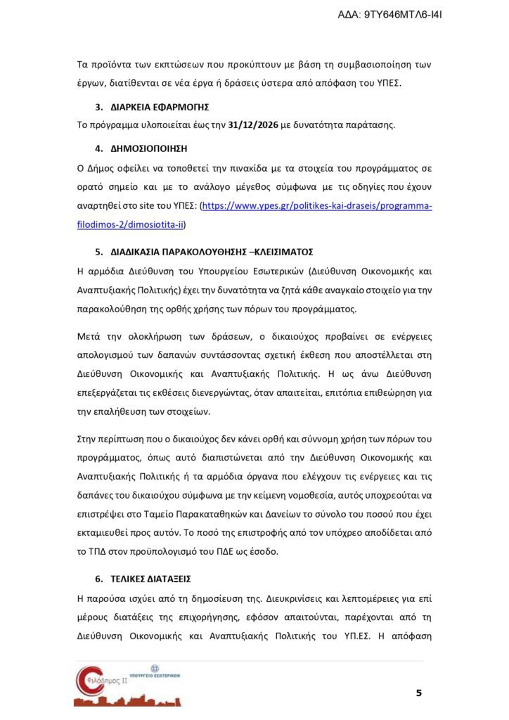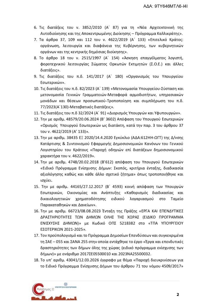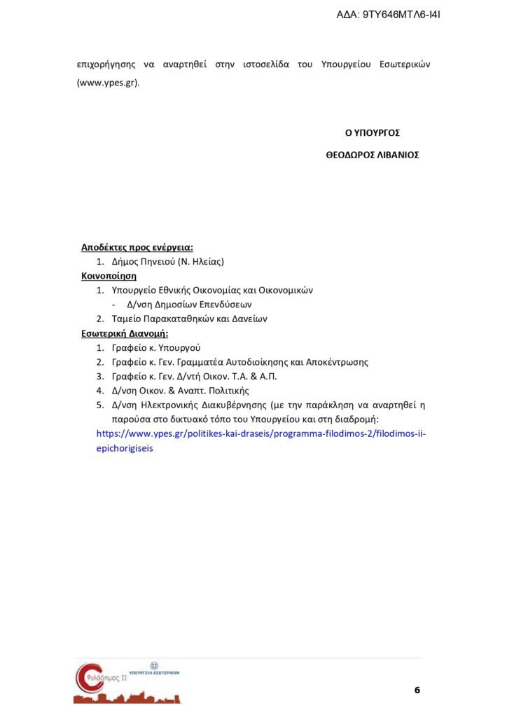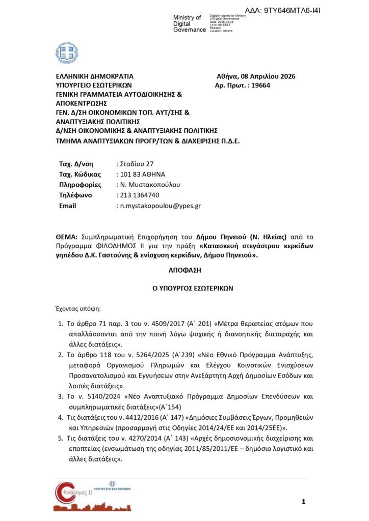 Ο Δήμαρχος Πηνειού εκφράζει τις θερμές του ευχαριστίες προς τον Υπουργό Εσωτερικών Θεόδωρο Λιβάνιο για την άμεση ανταπόκριση και την εμπιστοσύνη στο δίκαιο αίτημα του Δήμου, καθώς και προς τις υπηρεσίες του Υπουργείου Εσωτερικών που συνέβαλαν καθοριστικά στην ολοκλήρωση της διαδικασίας.
