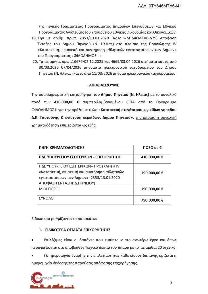 Η σημερινή απόφαση του Υπουργείου Εσωτερικών για τη συμπληρωματική επιχορήγηση του Δήμου Πηνειού με το ποσό των 410.000 ευρώ για το έργο «Κατασκευή στεγάστρου κερκίδων γηπέδου Δ.Κ. Γαστούνης & ενίσχυση κερκίδων» αποκαθιστά πλήρως την αλήθεια και δικαιώνει τις επιλογές του Δημάρχου και της Δημοτικής Αρχής.
