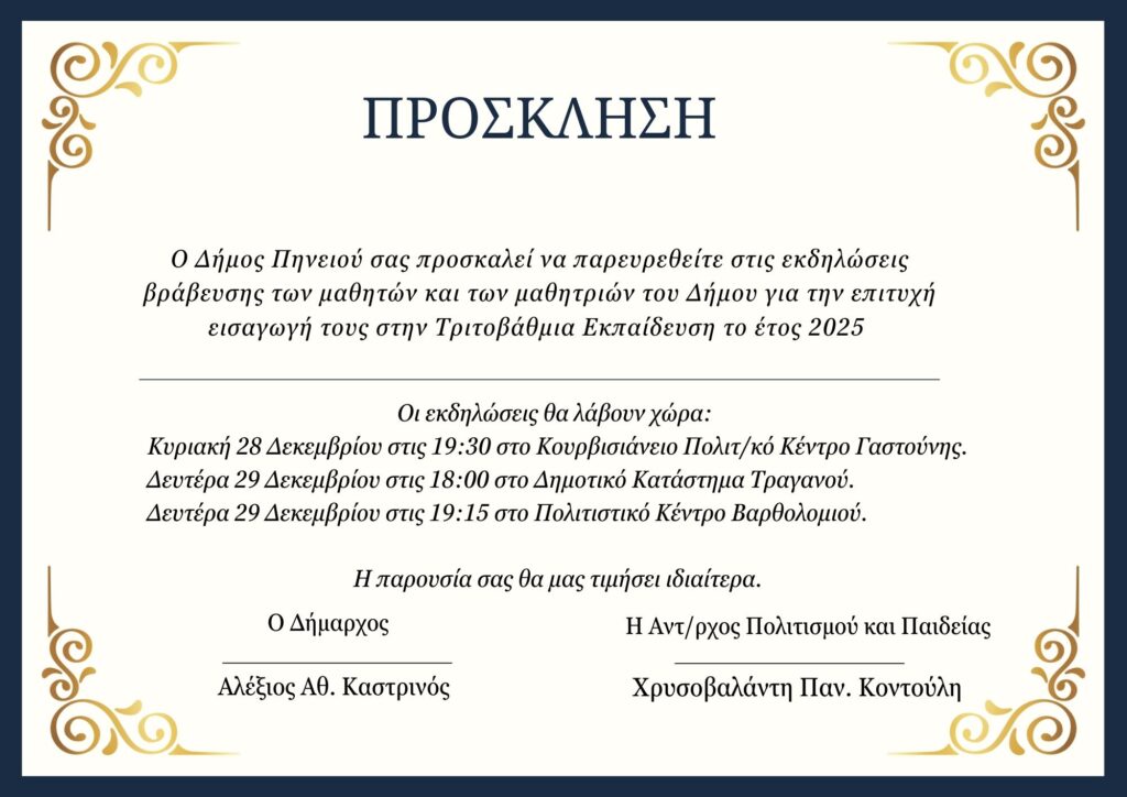 Ο Δήμος Πηνειού τιμά και βραβεύει τους μαθητές και τις μαθήτριες της Γ΄ Λυκείου που πέτυχαν την εισαγωγή τους σε Σχολές της Τριτοβάθμιας Εκπαίδευσης κατά το σχολικό έτος 2024-2025. Οι εκδηλώσεις βράβευσης θα πραγματοποιηθούν σε Γαστούνη, Τραγανό και Βαρθολομιό, αναδεικνύοντας την προσπάθεια, την επιμονή και την αριστεία των νέων του τόπου μας.