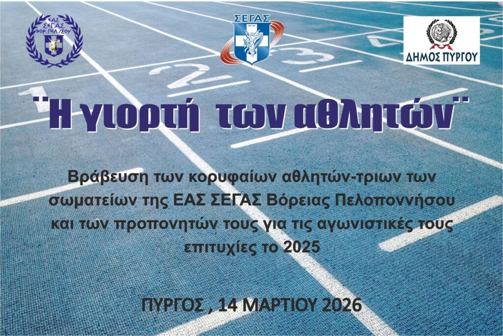 Δύο σημαντικές εκδηλώσεις της ΕΑΣ ΣΕΓΑΣ Βόρειας Πελοποννήσου σε συνεργασία με τον Δήμο Πύργου πραγματοποιούνται το Σάββατο 14 Μαρτίου 2026, στο Κλειστό Στάδιο «Γ. Βασιλακόπουλος» και στο Πάρκο Ξυστρή αντίστοιχα.