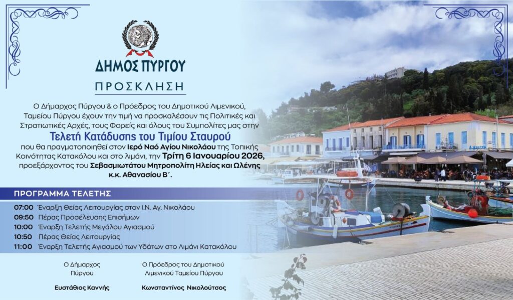 Ο Δήμος Πύργου προσκαλεί τους πολίτες και τους επισκέπτες της περιοχής να τιμήσουν με την παρουσία τους τον εορτασμό των Αγίων Θεοφανείων, την Τρίτη 6 Ιανουαρίου 2026, στο επίνειο της πρωτεύουσας της Ηλείας, το Κατάκολο.