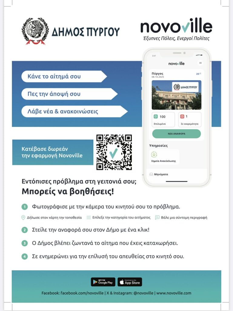 Ο Δήμος Πύργου συνεχίζει με σταθερά βήματα τον ψηφιακό μετασχηματισμό των υπηρεσιών του, αξιοποιώντας τη σύγχρονη πλατφόρμα Novoville. Στόχος της δημοτικής αρχής είναι η άμεση και αποτελεσματική εξυπηρέτηση των πολιτών σε θέματα καθημερινότητας, καθώς και η ενίσχυση της περιβαλλοντικής ενημέρωσης.