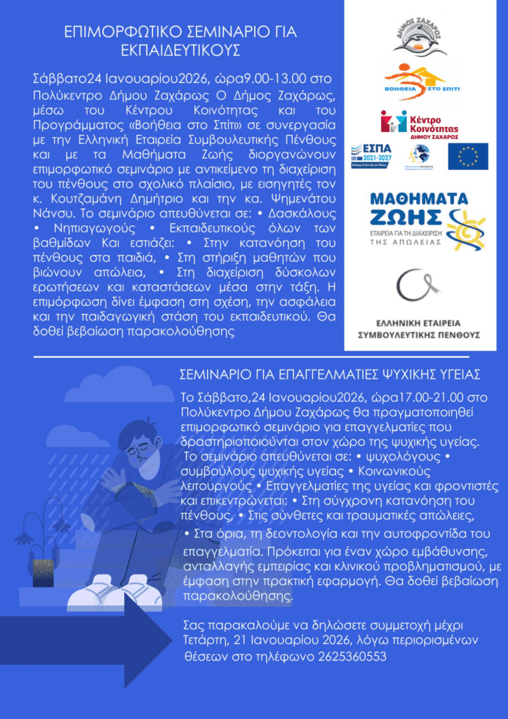 Ο Δήμος Ζαχάρως, μέσω του Κέντρου Κοινότητας και του Προγράμματος «Βοήθεια στο Σπίτι», σε συνεργασία με την Ελληνική Εταιρεία Συμβουλευτικής Πένθους και τα Μαθήματα Ζωής, διοργανώνει ανοιχτή ομιλία και επιμορφωτικά σεμινάρια με θέμα “Το πένθος και η απώλεια”