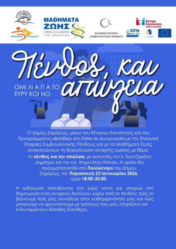 Ο Δήμος Ζαχάρως, μέσω του Κέντρου Κοινότητας και του Προγράμματος «Βοήθεια στο Σπίτι», σε συνεργασία με την Ελληνική Εταιρεία Συμβουλευτικής Πένθους και τα Μαθήματα Ζωής, διοργανώνει ανοιχτή ομιλία και επιμορφωτικά σεμινάρια με θέμα “Το πένθος και η απώλεια”