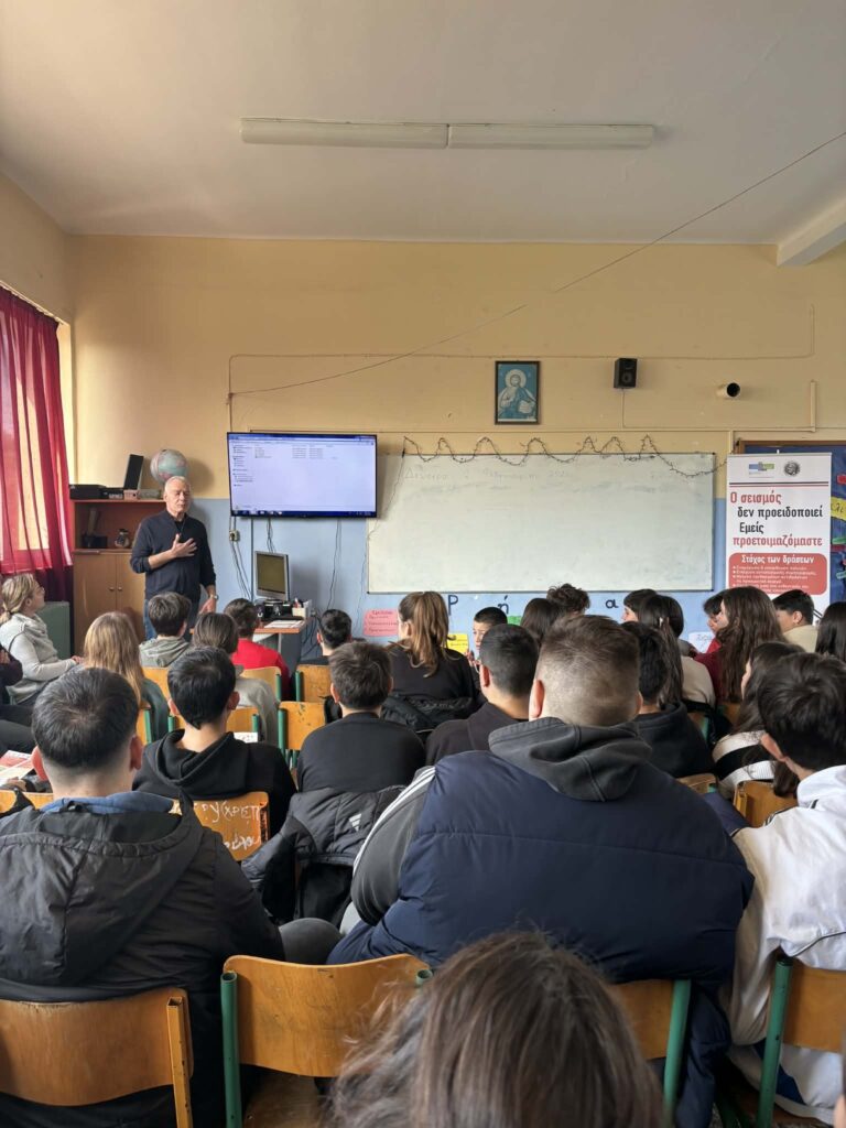 Κατά τη διάρκεια της εκδήλωσης, ο Αντιδήμαρχος Παιδείας, Αθλητισμού και Τουρισμού, κος Χρυσανθακόπουλος Αντώνης, αναφέρθηκε στις δράσεις και στις προβλέψεις του Δήμου που αφορούν τα σχολεία, υπογραμμίζοντας τη σημασία της πρόληψης και της συστηματικής φροντίδας των σχολικών υποδομών. Στη συνέχεια, ο κος Παναγιώτης Ζουρντός, μηχανικός και εκπρόσωπος του Τεχνικού Επιμελητηρίου Ελλάδας (ΤΕΕ), παρουσίασε με απλό και κατανοητό τρόπο στους μαθητές το φαινόμενο του σεισμού, εξηγώντας τι είναι, πώς εκδηλώνεται και γιατί η σωστή προετοιμασία μπορεί να περιορίσει τις επιπτώσεις του.