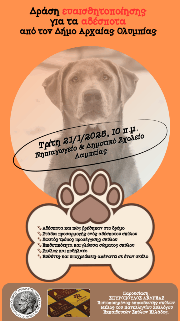 Ο Δήμος Αρχαίας Ολυμπίας, με πρωτοβουλία του αρμόδιου Αντιδημάρχου για τα αδέσποτα ζώα, Δημοσθένη Κατσίκα, ξεκινά δράσεις ευαισθητοποίησης των μαθητών για τα αδέσποτα ζώα, στα σχολεία της Πρωτοβάθμιας και Δευτεροβάθμιας Εκπαίδευσης του Δήμου.