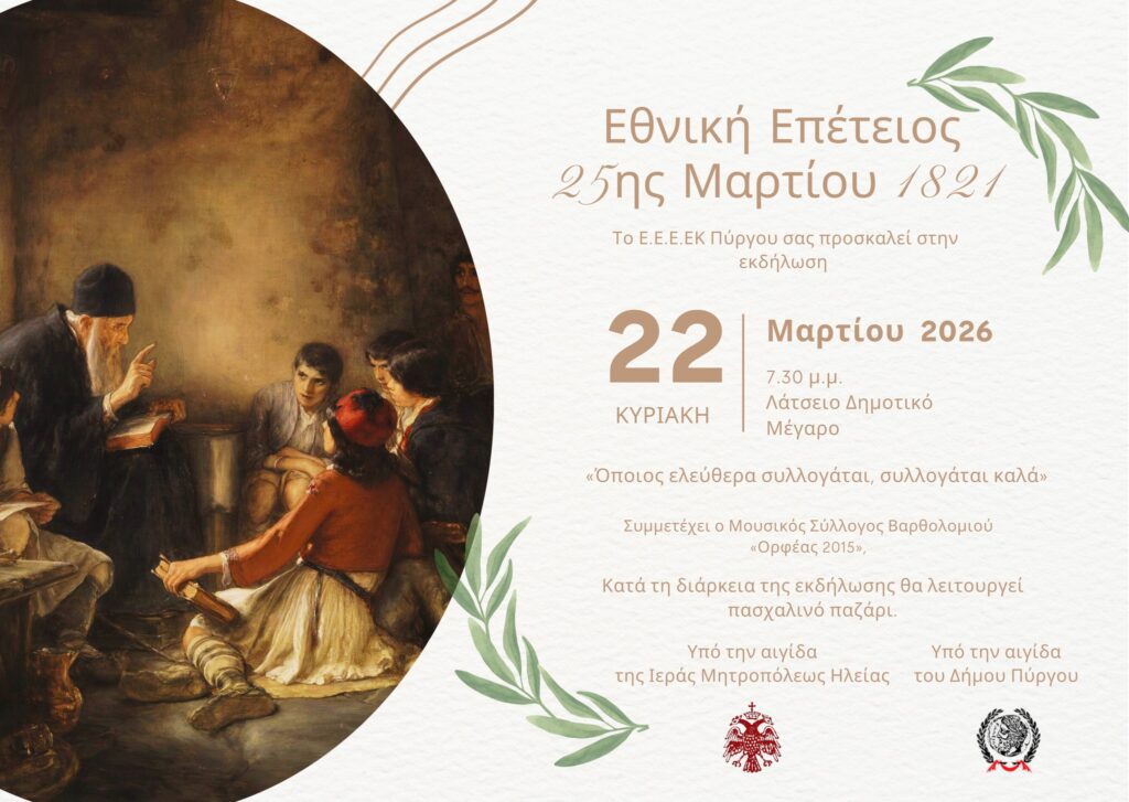 Το Ε.Ε.Ε.Ε.Κ. Πύργου διοργανώνει εκδήλωση αφιερωμένη στην εθνική επέτειο της 25ης Μαρτίου την Κυριακή 22 Μαρτίου, τιμώντας μια ημέρα με ιδιαίτερη σημασία για τον Ελληνισμό και την Ορθοδοξία.