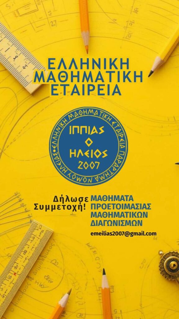 Το Παράρτημα Ηλείας της Ελληνικής Μαθηματικής Εταιρείας (Ε.Μ.Ε.) “Ιππίας ο Ηλείος” προσκαλεί μαθητές Γυμνασίου και Λυκείου να συμμετάσχουν δωρεάν στα μαθήματα προετοιμασίας για τους μαθηματικούς διαγωνισμούς «Θαλής» και «Δημήτρης Ζούνης».