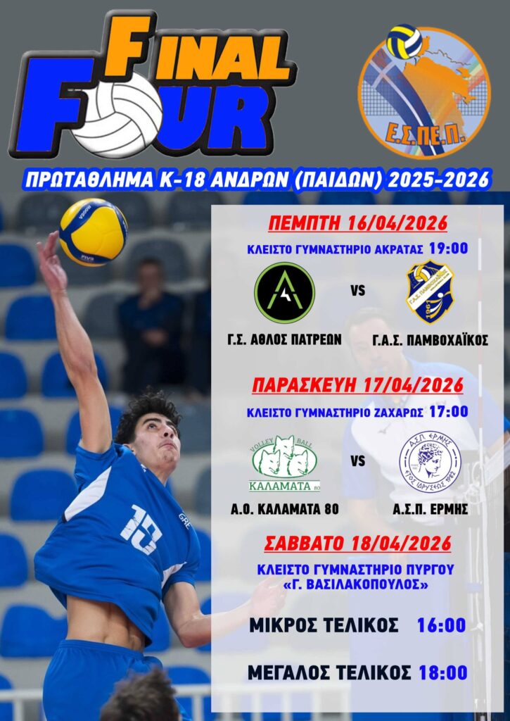 Η Ένωση Σωματείων Πετοσφαίρισης Πελοποννήσου ανακοίνωσε ότι η διεξαγωγή της Τελικής Φάσης (Final-4) του Πρωταθλήματος Κ-18 Αγοριών, θα πραγματοποιηθεί από τις 16 έως τις 18 Απριλίου στις πόλεις Ακράτα, Ζαχάρω και Πύργο.
