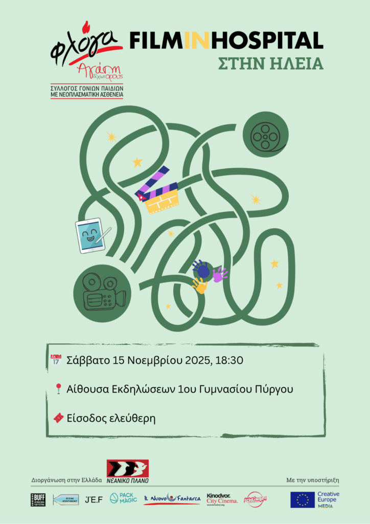 Μια ξεχωριστή κινηματογραφική δράση, αφιερωμένη στα παιδιά που έδωσαν έναν μεγάλο αγώνα υγείας και επιστρέφουν στη σχολική και κοινωνική τους ζωή, αλλά και σε όλους τους μαθητές που καλούνται να μάθουν να συνυπάρχουν με σεβασμό, αποδοχή και ενσυναίσθηση διοργανώνουν το Σάββατο 15 Νοεμβρίου 2025 και ώρα 18:30, στην αίθουσα εκδηλώσεων του 1ου Γυμνασίου Πύργου η Φλόγα Ν. Ηλείας και το Νεανικό Πλάνο στο πλαίσιο του ευρωπαϊκού προγράμματος Film in Hospital.