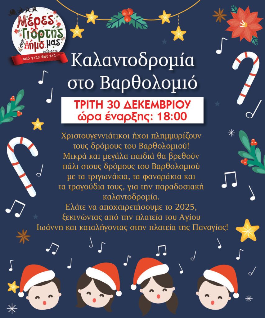 Το εορταστικό πρόγραμμα συνεχίζεται την Τρίτη, 30 Δεκεμβρίου, στις 18:00 με την παραδοσιακή Καλαντοδρομία στο Βαρθολομιό. Χριστουγεννιάτικοι ήχοι θα πλημμυρίσουν τους δρόμους της πόλης, καθώς μικρά και μεγάλα παιδιά, με τριγωνάκια, φαναράκια και τραγούδια, θα μεταφέρουν το μήνυμα των ημερών σε μια γιορτινή πομπή που θα ξεκινήσει από την πλατεία Αγίου Ιωάννη και θα καταλήξει στην πλατεία Παναγίας.