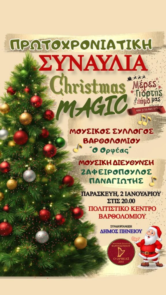 Οι χριστουγεννιάτικες εκδηλώσεις του Δήμου Πηνειού ολοκληρώνονται την Παρασκευή 2 Ιανουαρίου και ώρα 20:00 στο Πολιτιστικό Κέντρο Βαρθολομιού, όπου ο Μουσικός Σύλλογος Βαρθολομιού «Ο Ορφέας» θα παρουσιάσει μια ακόμη ξεχωριστή συναυλία, με έργα από το ελληνικό και διεθνές ρεπερτόριο, προσκαλώντας το κοινό σε μια νέα μουσική συνάντηση γεμάτη αγάπη, συγκίνηση και χριστουγεννιάτικη νοσταλγία.
