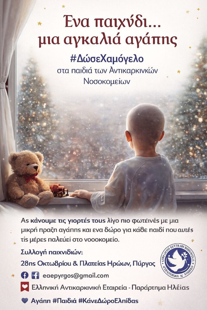 Το Παράρτημα Ν. Ηλείας της Ελληνικής Αντικαρκινικής Εταιρείας προσκαλεί όλους τους συμπολίτες μας  να συμμετάσχουν στη χριστουγεννιάτικη δράση «Ένα παιχνίδι… μια αγκαλιά αγάπης», προσφέροντας ένα παιχνίδι  που θα μοιραστεί στα Αντικαρκινικά Νοσοκομεία της χώρας, για τα παιδιά που νοσηλεύονται.