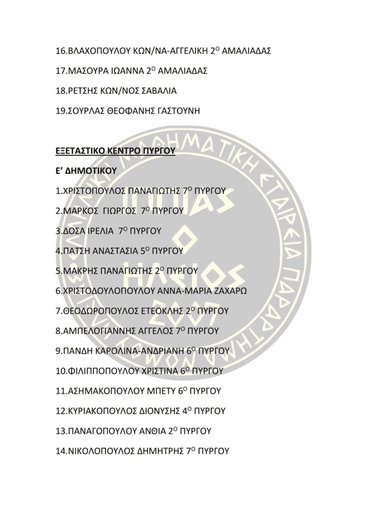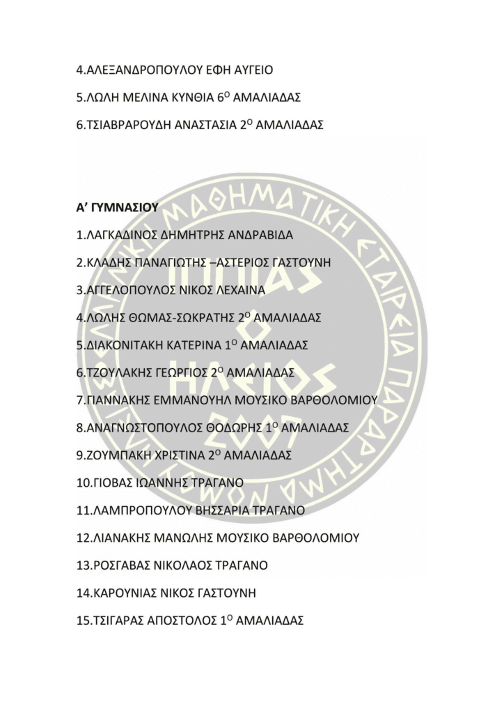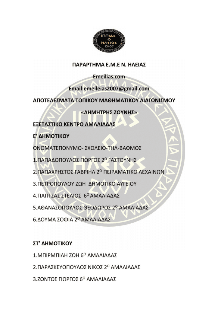 Το Παράρτημα Ηλείας της Ελληνικής Μαθηματικής Εταιρείας ανακοινώνει τους 88 μαθητές που διακρίθηκαν στον 6ο Τοπικό Μαθηματικό Διαγωνισμό «Δημήτριος Ζούνης», ο οποίος διοργανώθηκε για μαθητές Ε΄ και ΣΤ΄ τάξης Δημοτικού καθώς και Α΄ Γυμνασίου.