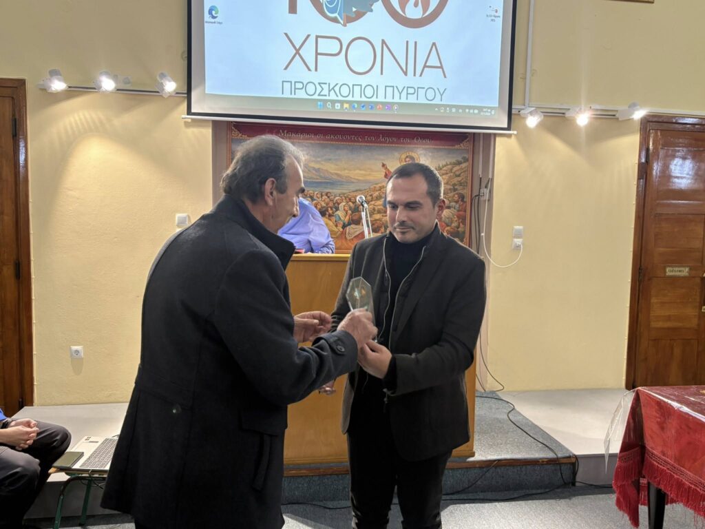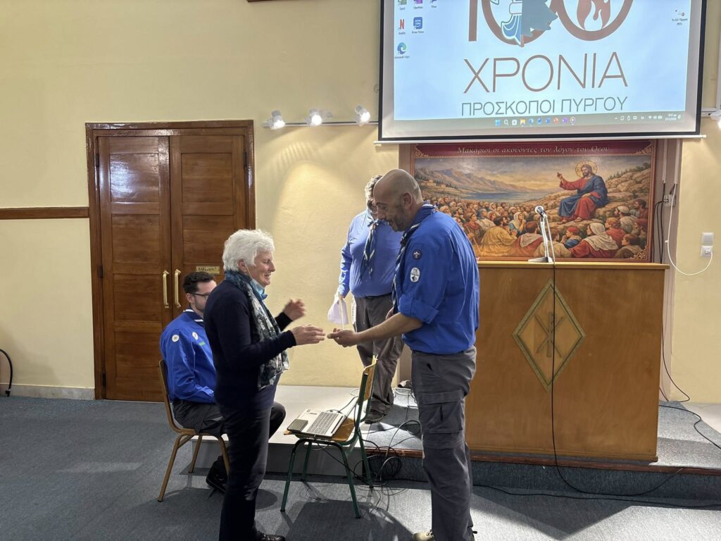 Ακολούθησαν σύντομοι χαιρετισμοί από τους επισήμους ενώ παράλληλα έγινε απονομή του αναμνηστικού των 100 χρόνων σε όλους όσους έχουν βοηθήσει το 1ο Σύστημα Πύργου από θέσεις ευθύνης. Πιο συγκεκριμένα στους Περιφερειακούς Εφόρους Ηλείας Κώστα Τριανταφυλλόπουλο και Χρήστο Παπαγεωργίου, στους Τοπικούς Εφόρους Πύργου Άγγελο Παναγιωτακόπουλο, Βασίλη Ρασούλη και Θύμιο Κολοκοτρώνη  και τους Αρχηγούς Συστήματος Καρολίνα Γκούτη, Κώστα Κολοκοτρώνη και Παναγιώτη Καρακίτσο αλλά και στην Πρόεδρο της Επιτροπής Κοινωνικής Συμπαράστασης Άννα Χρυσανθακοπούλου.