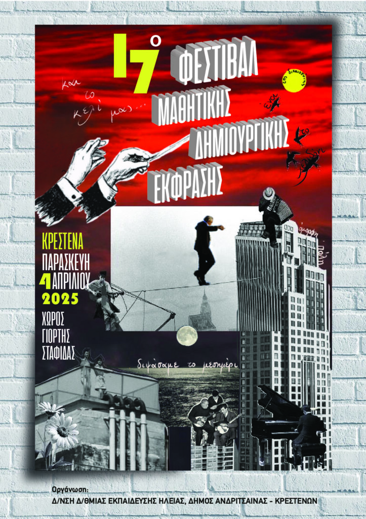 Σε τελικό στάδιο βρίσκονται οι προετοιμασίες για τη διεξαγωγή του 17ου Φεστιβάλ Μαθητικής Δημιουργικής Έκφρασης, που θα γίνει την Παρασκευή 4 Απριλίου 2025 και ώρα 10 π.μ. στο χώρο της Γιορτής Σταφίδας Κρεστένων, με διοργανωτές τη Δ/νση Δ/θμιας Εκπαίδευσης Ηλείας και το Δήμο Ανδρίτσαινας-Κρεστένων.