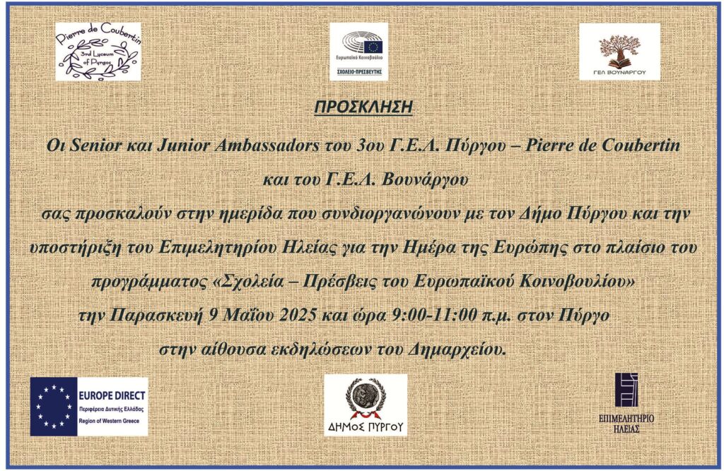 Το 3ο ΓΕΛ Πύργου – Pierre de Coubertin και το ΓΕΛ Βουνάργου, την Παρασκευή 9 Μαΐου 2025, Ημέρα της Ευρώπης, πραγματοποιούν Ημερίδα στο πλαίσιο του προγράμματος «Σχολεία Πρέσβεις του Ευρωπαϊκού Κοινοβουλίου» (EPAS) σε συνεργασία με τον Δήμο Πύργου και την υποστήριξη του Επιμελητηρίου Ηλείας στην αίθουσα εκδηλώσεων του Δημαρχείου Πύργου με θέμα :