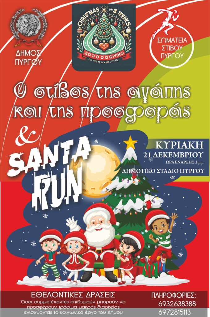 Σε όλους τους συμμετέχοντες θα απονεμηθούν χριστουγεννιάτικοι σκούφοι, μετάλλια και χριστουγεννιάτικα κεράσματα. Δικαίωμα συμμετοχής στο SANTA RUN (από το Δημοτικό Στάδιο έως την κεντρική πλατεία του Πύργου) έχουν όλα τα παιδιά.