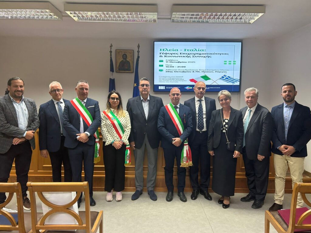 Με μια επιτυχημένη, πολυεπίπεδη εκδήλωση που ανέδειξε τη δυναμική της εξωστρέφειας και της κοινωνικής αλληλεγγύης, το Επιμελητήριο Ηλείας, σε συνεργασία με το Ελληνο-Ιταλικό Επιμελητήριο Αθηνών, ολοκλήρωσε το Σάββατο, 11 Οκτωβρίου 2025, την ημερίδα «Ηλεία – Ιταλία: Χτίζοντας Γέφυρες Επιχειρηματικότητας & Κοινωνικής Συνοχής». Η εκδήλωση, που πραγματοποιήθηκε στην έδρα του Επιμελητηρίου στον Πύργο, επισφράγισε τις τελετές αδελφοποίησης Δήμων της Ηλείας με πόλεις της Κάτω Ιταλίας, στο πλαίσιο του Ευρωπαϊκού Προγράμματος OLYMPICEU.