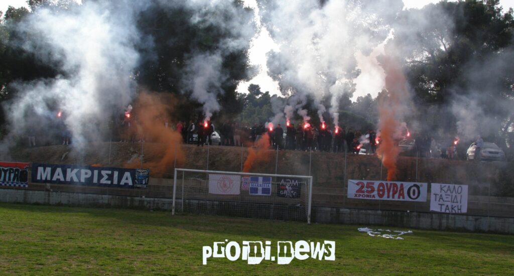 Φαντασμαγορική ατμόσφαιρα δημιούργησαν το περασμένο Σάββατο οι οπαδοί του Α.Ο. Μακρισίων στον πρώτο αγώνα για τα πλέι-άουτ με αντίπαλο το Σκουροχώρι. 15 καπνογόνα άναψαν κατά την παρουσίαση των ομάδων, ενώ η ατμόσφαιρα φωτίστηκε με καπνογόνα τόσο στα δύο γκολ του Α.Ο.Μ. όσο και στη λήξη του παιχνιδιού. Μάλιστα, αμέσως μετά το τέλος του αγώνα οι παίκτες του Α.Ο.Μ. κατευθύνθηκαν προς το μέρος των οπαδών και τους χειροκρότησαν για την στήριξή τους.