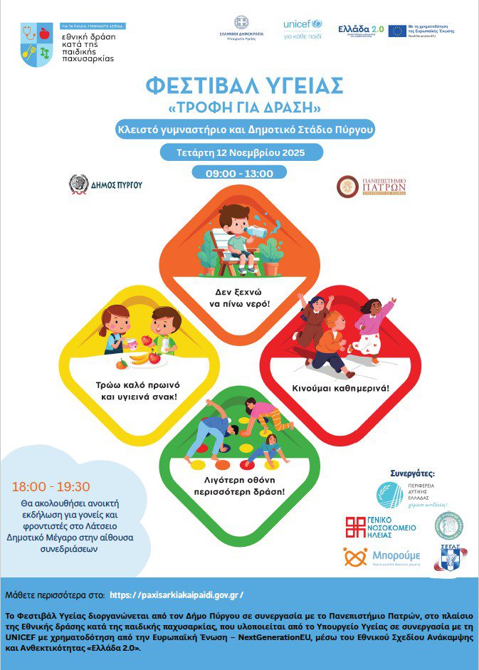Ο Δήμος Πύργου, στο πλαίσιο των δράσεων προαγωγής της δημόσιας υγείας και της ευαισθητοποίησης της τοπικής κοινωνίας, διοργανώνει σήμερα Τετάρτη 12 Νοεμβρίου 2025 το Φεστιβάλ Υγείας με θέμα «Τροφή για Δράση».