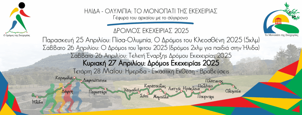 Για 10η συνεχή χρονιά η «Συμπολιτεία Ολυμπίας» διοργανώνει σε Αρχαία Ήλιδα και Αρχαία Ολυμπία, στο «Μονοπάτι της Εκεχειρίας 2025», το οποίο περιλαμβάνει τις εξής αθλητικές εκδηλώσεις: «Δρόμος του Κλεοσθένη», παιδικός – εφηβικός Αγώνας «Δρόμος του Ίφιτου» και «Δρόμος Εκεχειρίας», ενώ το Σάββατο 26 Απριλίου 2025 θα πραγματοποιηθεί η μεγάλη τελετή έναρξης στο θέατρο της Αρχαίας ‘Ηλιδας.
