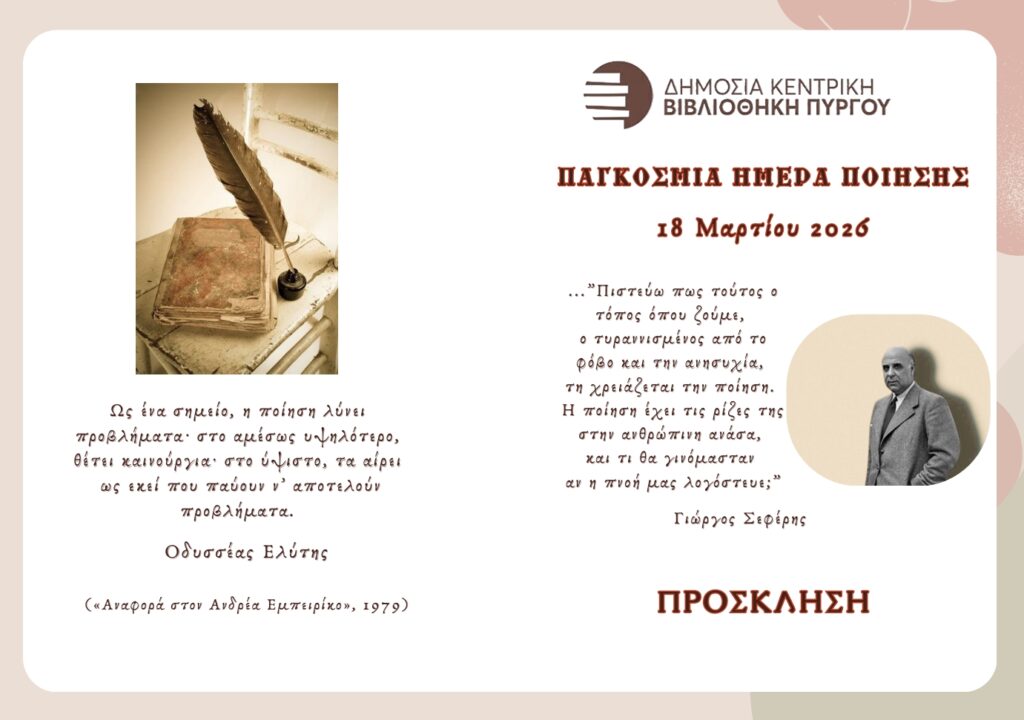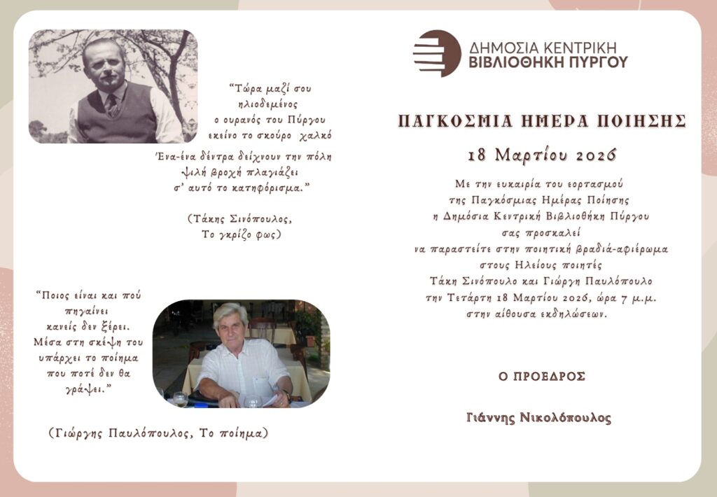 Επ’ ευκαιρία του εορτασμού της Παγκόσμιας Ημέρας Ποίησης, η Δημόσια Κεντρική Βιβλιοθήκη Πύργου θα τιμήσει τη μνήμη και το έργο των κορυφαίων Ηλείων ποιητών: του Τάκη Σινόπουλου και του Γιώργη Παυλόπουλου, με φιλολογική εκδήλωση, την προσεχή Τετάρτη 18-03-2026 στις 7 μ.μ., στην αίθουσα εκδηλώσεων.