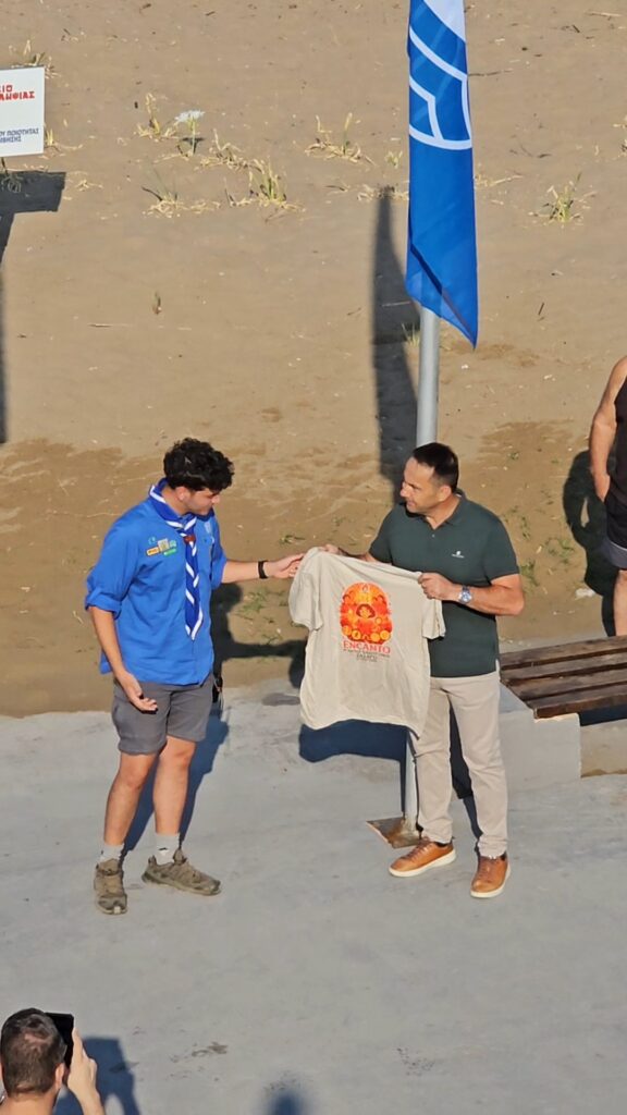 Στο τέλος της τελετής, ο εκπρόσωπος των προσκόπων που διαμένουν κατά το διάστημα αυτό στη Ζαχάρω προσέφερε στον Δήμαρχο ένα αναμνηστικό μπλουζάκι, σε ένδειξη ευγνωμοσύνης για τη συνεργασία και την υποστήριξη τού Δήμου στην προσκοπική κατασκήνωση και στις δράσεις τους.