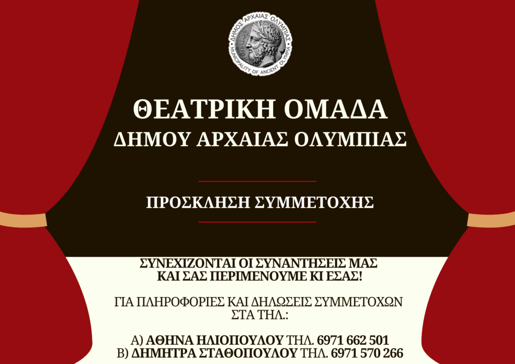 Για το λόγο αυτό, ο Δήμος Αρχαίας Ολυμπίας απευθύνει εκ νέου ανοιχτό κάλεσμα για συμμετοχές, σε όλουςόσους αγαπούν το θέατρο και ενδιαφέρονται να ασχοληθούν ερασιτεχνικά.