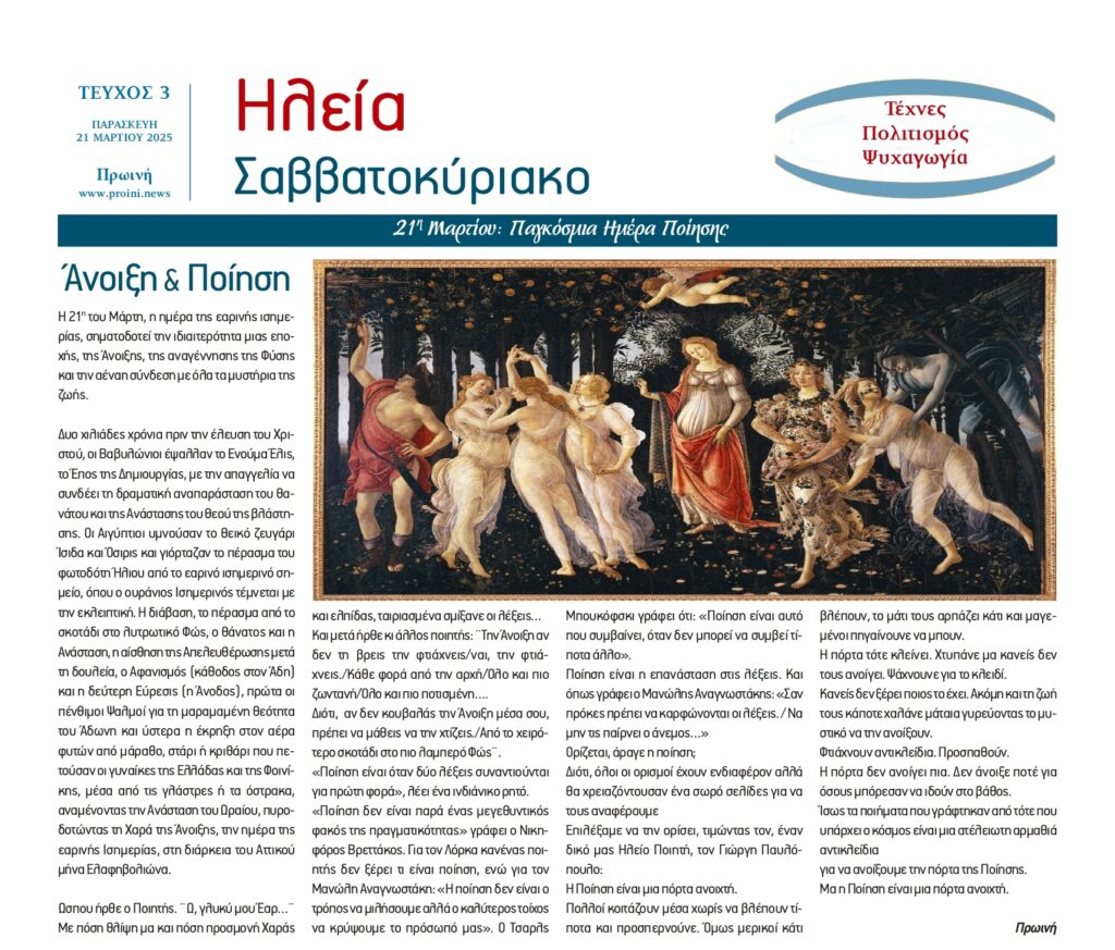 Με αφορμή την Παγκόσμια Μέρα Ποίησης το ένθετο “Ηλεία Σαββατοκύριακο” της Πρωινής είναι αφιερωμένο σε Ηλείους Ποιητές, σε μια νεανική φωνή και την ποίηση γενικότερα!