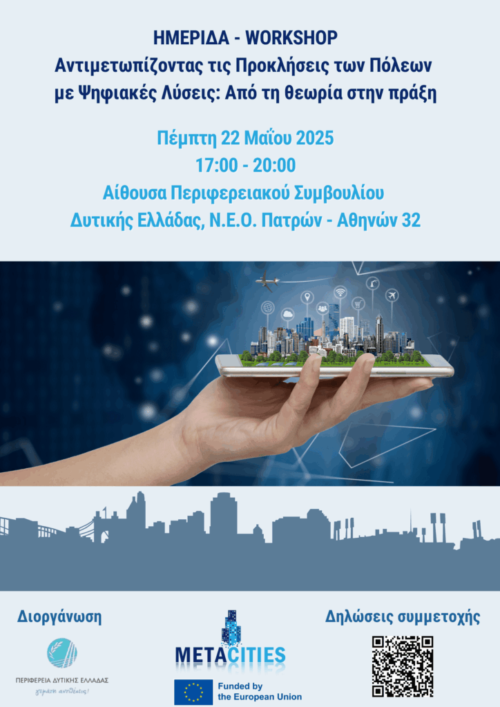 Η Περιφέρεια Δυτικής Ελλάδας, εταίρος στο έργο Metacities Excellence Hub στη Νοτιοανατολική Ευρώπη, διοργανώνει εξειδικευμένο εργαστήριο/ημερίδα με θέμα: «Αντιμετωπίζοντας τις Προκλήσεις των Πόλεων με Ψηφιακές Λύσεις: Από τη θεωρία στην πράξη», την Πέμπτη 22 Μαΐου 2025 και ώρα 17.00-20.00, στην Αίθουσα Περιφερειακού Συμβουλίου Δυτικής Ελλάδας (Ν.Ε.Ο. Πατρών-Αθηνών 32, Πάτρα).