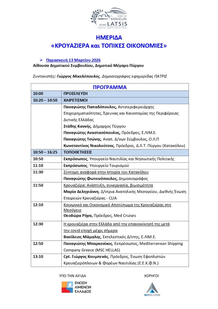 Το Δημοτικό Λιμενικό Ταμείο Πύργου (Κατάκολο) σας προσκαλεί να τιμήσετε με την παρουσία σας την Ημερίδα “Κρουαζιέρα και τοπικές οικονομίες”.