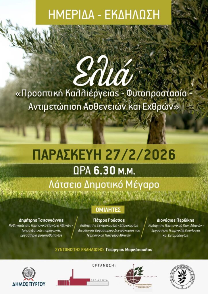 Ο Δήμος Πύργου και η ΔΕΠ ΑΕ ΟΤΑ Πύργου, σε συνεργασία με το παράρτημα Πελοποννήσου και Δυτικής Στερεάς Ελλάδος του ΓΕΩΤΕΕ και τον Αγροτικό Συνεταιρισμό Πύργου, διοργανώνουν εκδήλωση – συζήτηση για την ελιά, τις ασθένειες και τους εχθρούς που προσβάλουν την καλλιέργεια, καθώς επίσης και τους σύγχρονους τρόπους αντιμετώπισής τους.